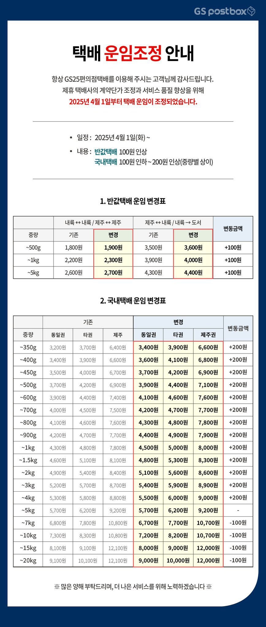 오랜만에 중고거래 사이트에서 거래가 되어 .일반 택배를 이용했는데gs25편의점 택배 가격 보고 깜짝 놀랐어요.이어폰 1개라서 최저 용량인데,타권역(다른 지역)배송이라 3900원 나와서 잘 못된줄 알고 한참 검색 했네요.반값택배는 편의점에서 택배를 보내고,픽업하는 방식인데일반 국내택배보다 가격이 착해요.타권역 1900원인데작년 1600원정도에서 많이 올랐어요.(gs25편의점 택배어플 이용시 할인권200원 적용을 수시로 하니 참고)편해서 좋은데택배 시간은 더 오래걸려요.5일 이상 걸린적도 있어요.25년 4월 1일부터 인상된 gs25편의점 택배 가격 참고하세요.