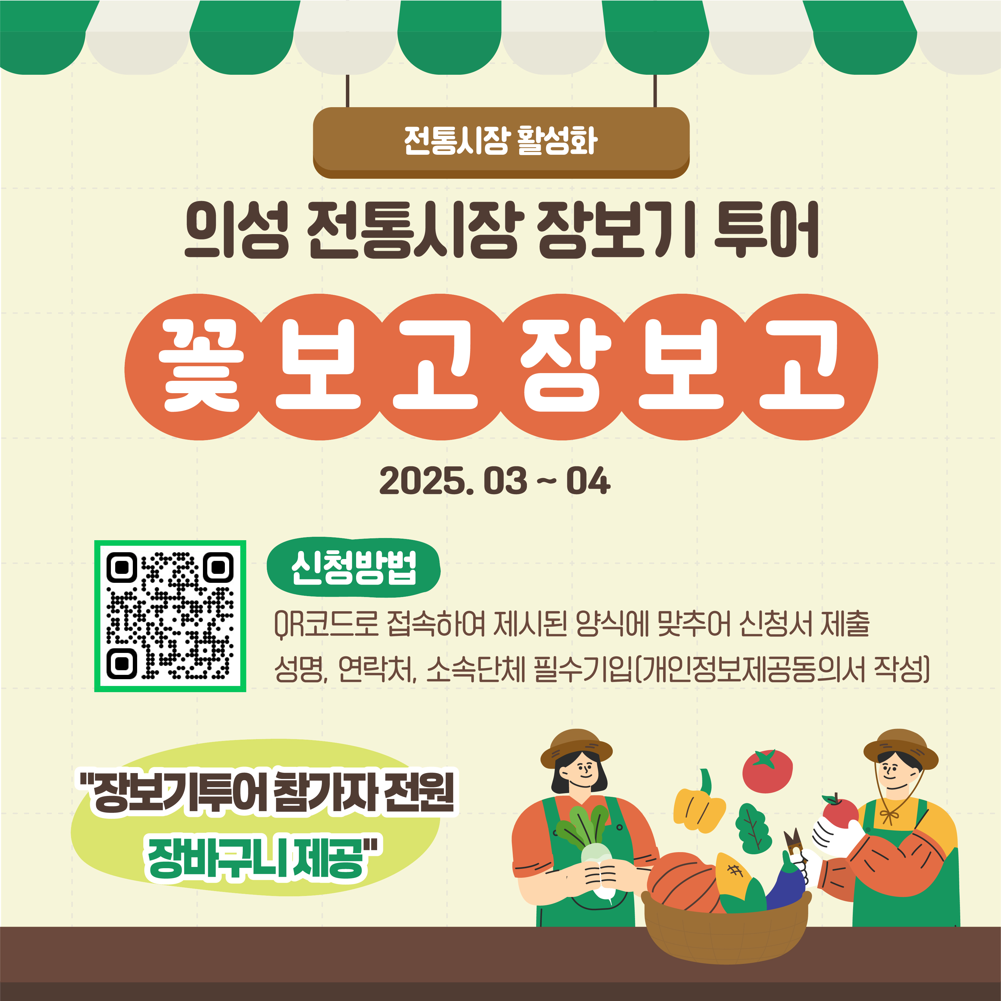 꽃샘 추위가 물러가고 , 봄이 찾아 왔습니다. 3월 22일 부터 시작되는 지역 전통 축제 정보 알려드려요.  의성 산수유 꽃맞이 행사와 함께 연계해서 다녀 올 수 있는 '전통시장 장보기' 지원 사업인데요.3월 17일 기준으로 서울,대구,구미,포항 등에서 단체 460명이 신청을 완료했다고 합니다.  의성축제로 유명한 "산수유축제,고운사, 의성조문국박물관 '등 관광과 함께 축제를 즐길 수  있어요.  꽃보고 장보고 , 경북 의성 전통시장 장보기 투어를 진행 하는데요. 일정은 25년 3월 22일 ~ 3월 30일까지 입니다.장소 : 경북 의성군 의성군 의성읍 전통시장 2길 15 (의성 전통시장)개설 주기: 상설 운영 + 매월 끝자리 2,7일마다 열리는 5일장 입니다. 참여 대상은 지역 축제 참가자, 의성 관광객..