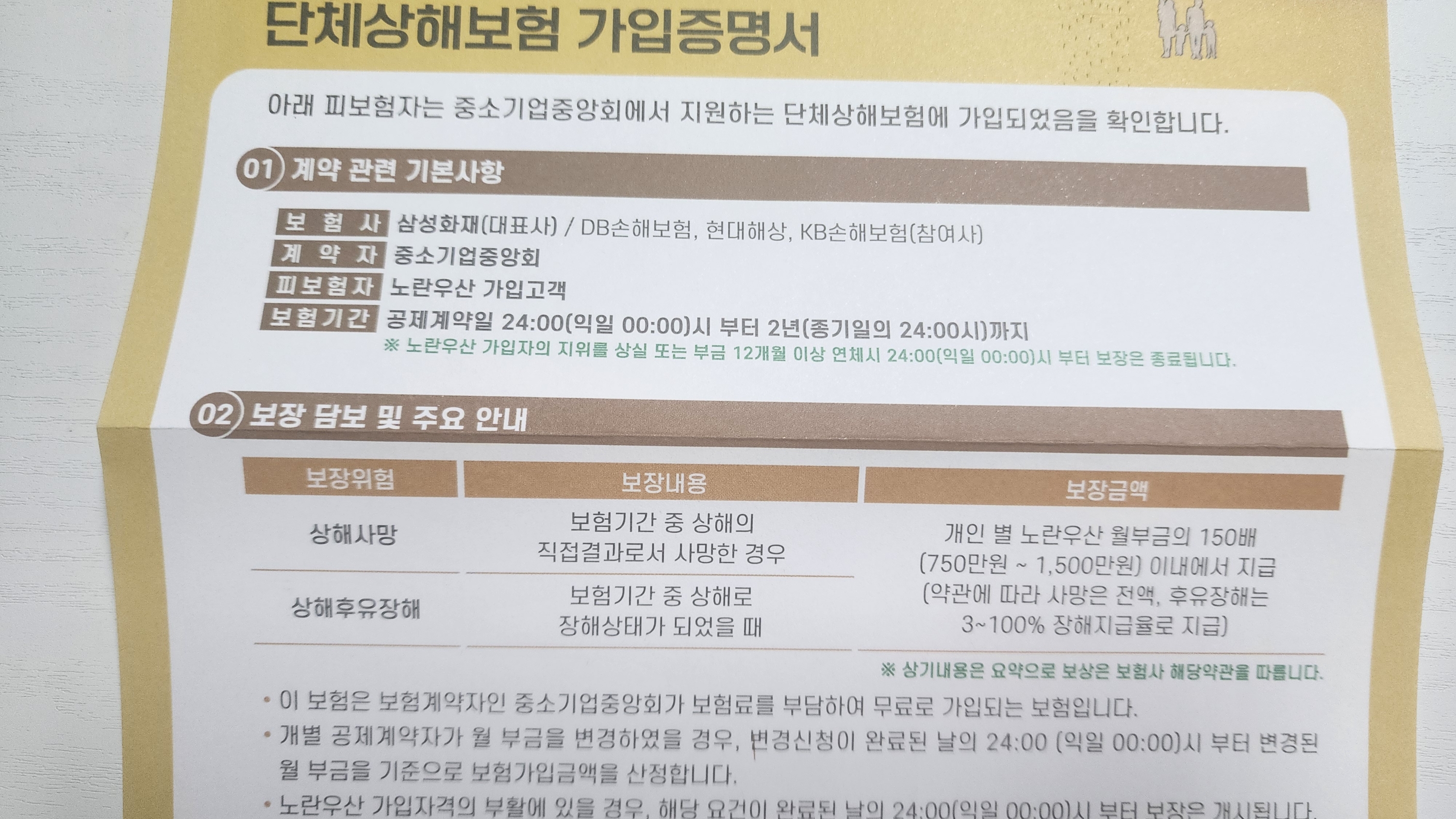 노란우산공제 혜택으로는 무료 상해 보험을 가입해 주는 건데요. 상해로 인한 사망 및 후유장애 발생 시 2년간 최고 월 부금액의 150배까지 보험금이 지급되며 보험료는 중소기업 중앙회가 부담합니다.