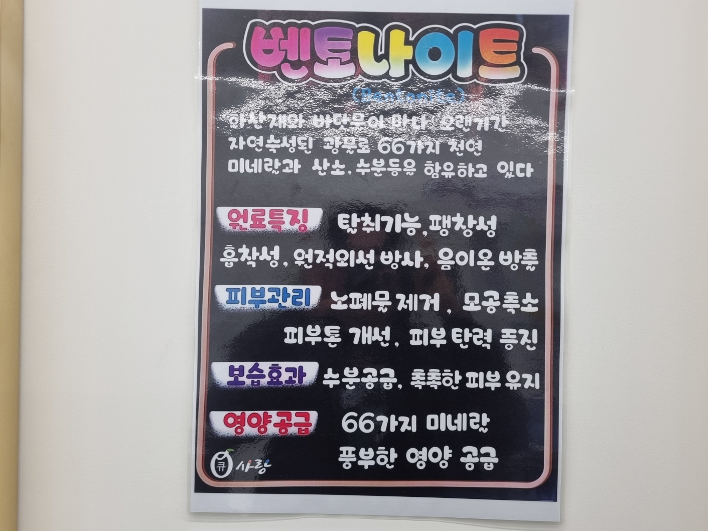 원장님이 설명해 주셨는데 벤토나이트는 물질이 들어가 있다고 하더라구요. 화산재와 바닷물이 만나서 오랜 기간 숙성된 광물이라네요.