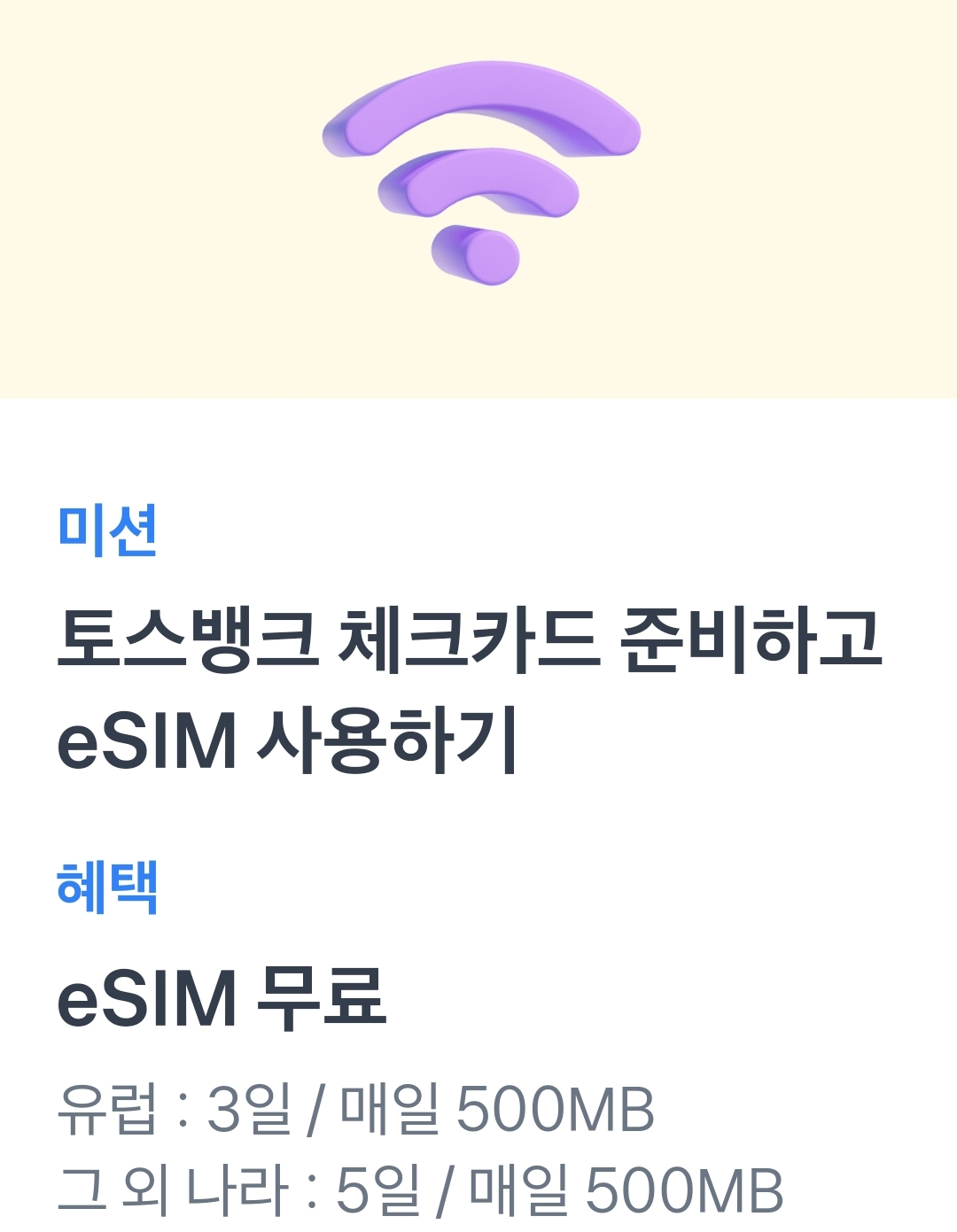 토스 뱅크 체크카드가 있는 분들을 대상으로 한 혜택인데요. eSIM 무료입니다. 유럽에서 3일간 이용하실 수 있으며 매일 500MB.
