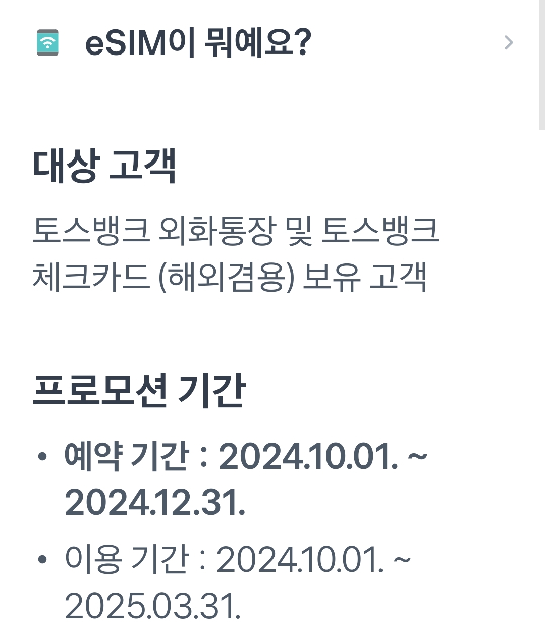 토스 체크카드가 있으신 분들 중에에 USIM이 필요하시거나 eSIM을 원하시는 분들 꼭 확인하셔서 무료로 WiFi 이용하시기 바랍니다.