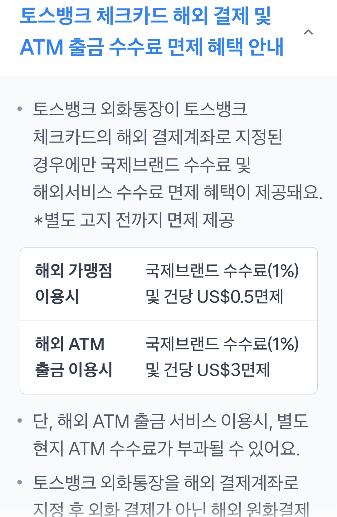 토스뱅크 체크카드 해외 결제 및 ATM 출금 수수료가 면제되니 꼭 만들어서 해외여행 갈 때 수수료 아껴 보세요.
