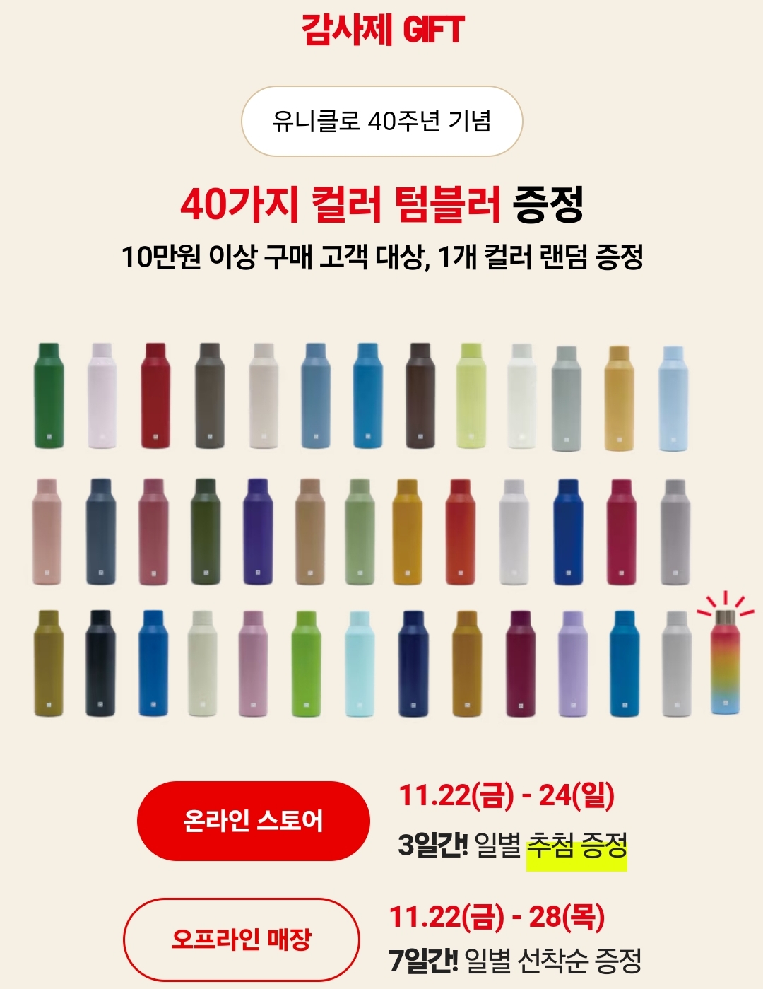 10만원 이상 구매 고객 대상으로 1개 컬러를 랜덤으로 증정한대요. 총 40 가지 컬러가 있다니 기대됩니다. 텀블러 한번 써보고 싶네요.