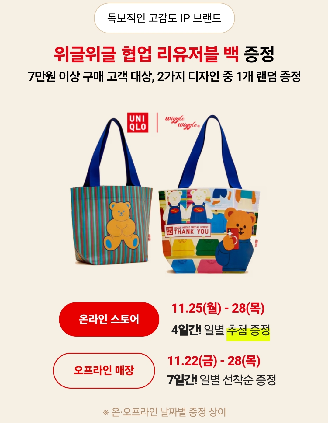 7만원 이상 구매 고객 대상은 두 가지 디자인 중 한 가지 위글위글 협업 리유저브 백증정합니다.
