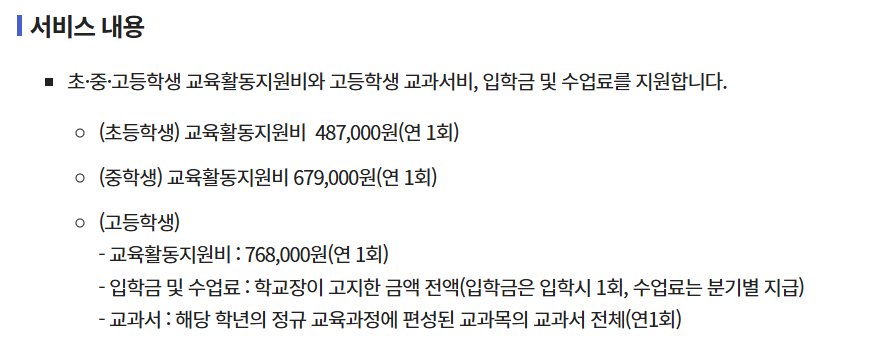초,중,고등학생 교육활동지원비와 고등학생 교과서비, 입학금 및 수업료를 지원하는데요.