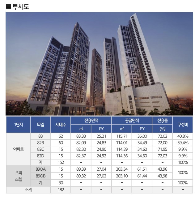 1단지는 지하 2층부터 지상 38층까지 2개 동으로 이루어져 있으며, 아파트 152세대와 오피스텔 30실로 구성되어 있습니다.