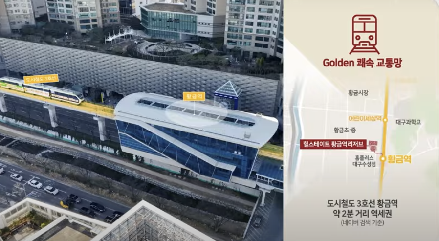 힐스테이트 황금역 리저브는 대구 도시철도 3호선 황금역까지 도보로 약 4분 거리에 위치한 초역세권 단지입니다.