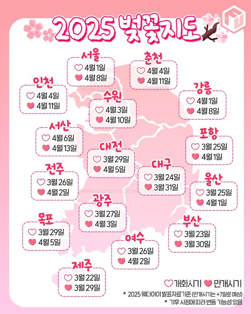 목포 4월 5일, 광주 4월 3일 , 여수 4월 2일 , 부산 3월 30일 ,울산 4월 1일, 대전 4월 5일 , 서울 4월 8일 ,강릉 4월 8일 ,인천 4월 11일 벚꽃이 절정에 이를 것으로 전망됩니다.