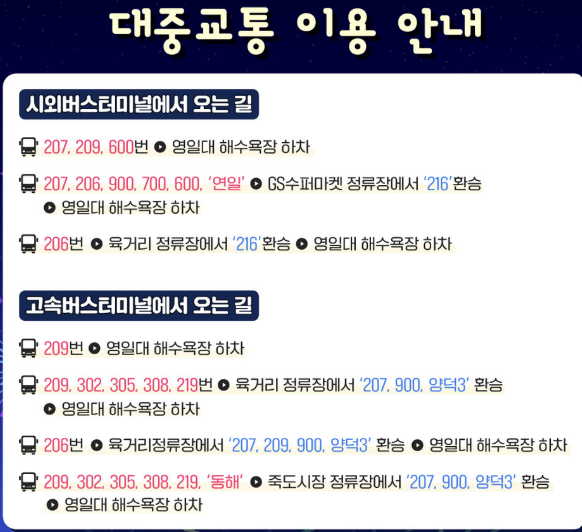 - 영일대 1·2 공영주차장: 축제장과 인접해 있어 접근성이 뛰어납니다.
